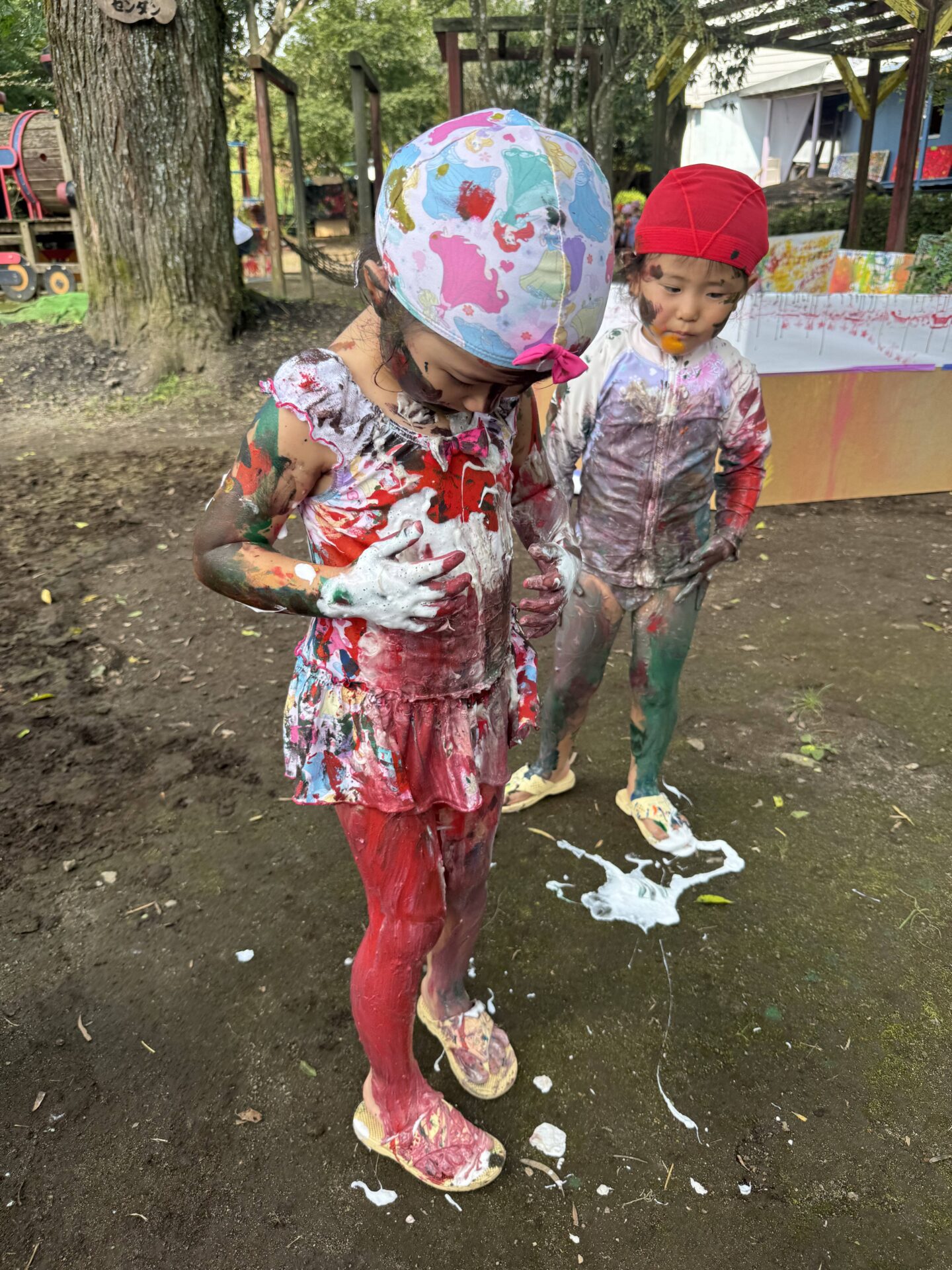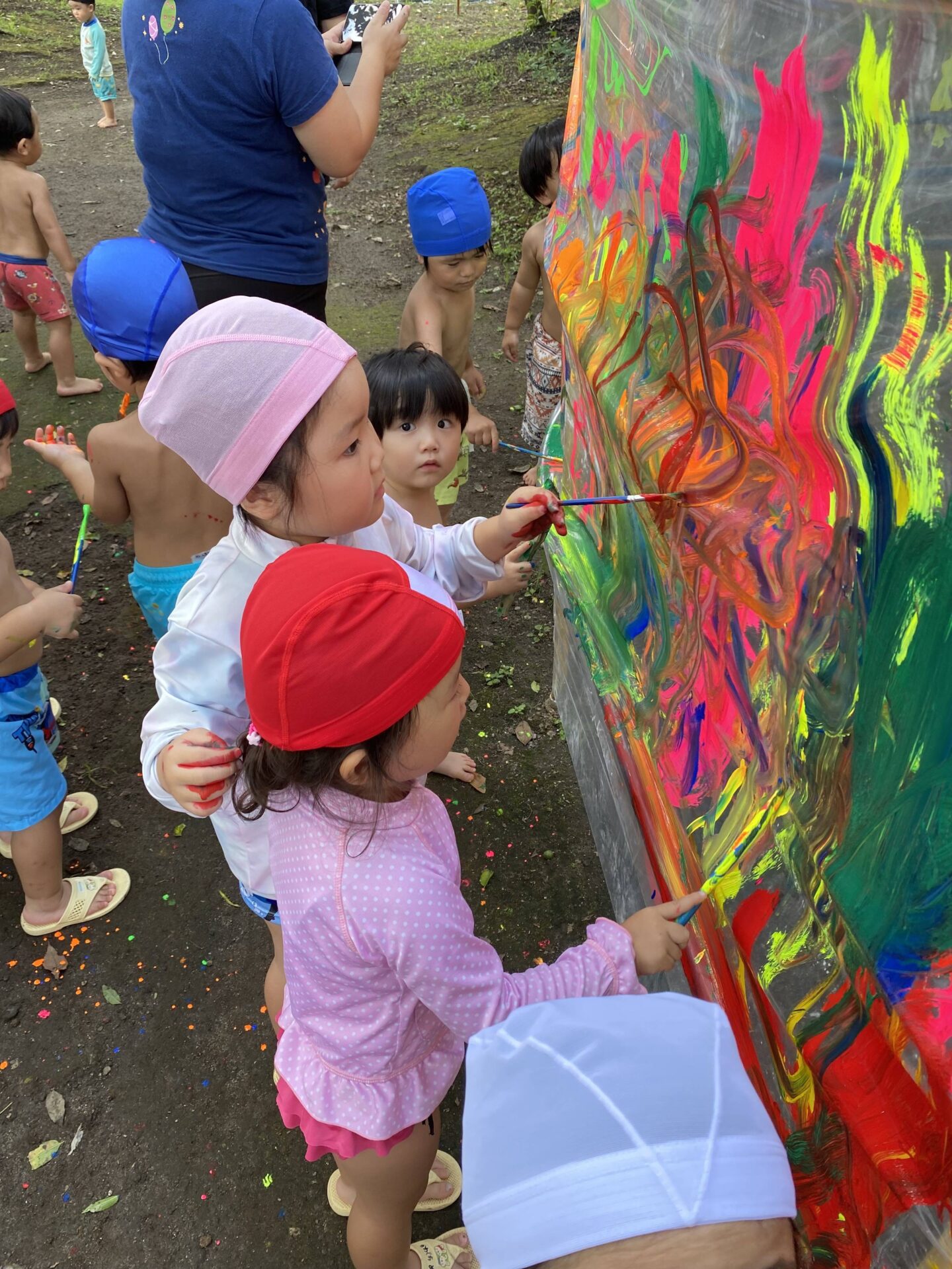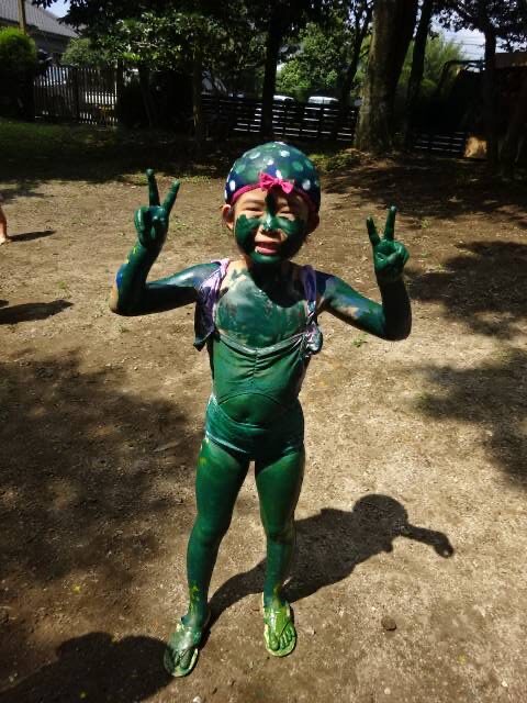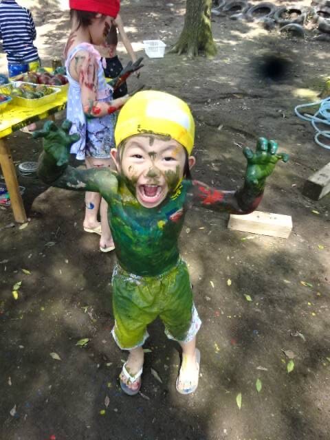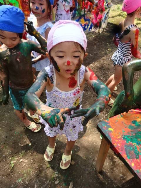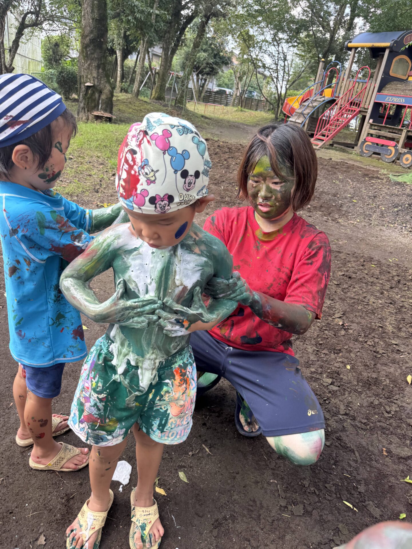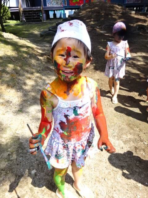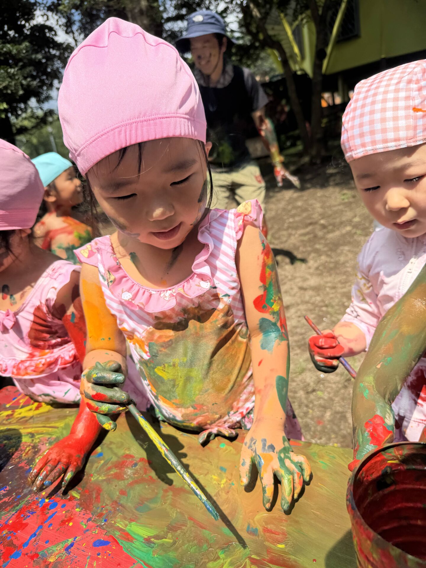 えのぐ遊びをした後はボディペインティング😆最初は体にえのぐが付くことを少しためらっていた子どもたちもいつしかダイナミックに体中にえのぐを塗って楽しみましたー!