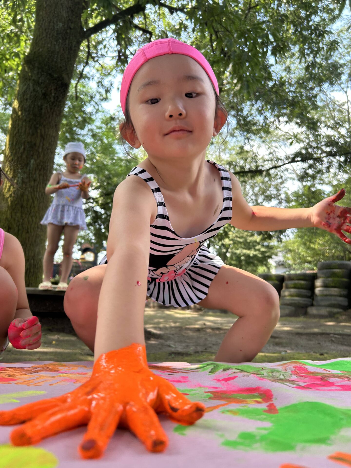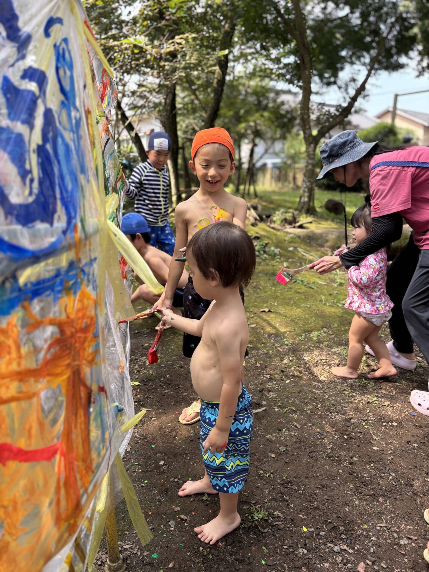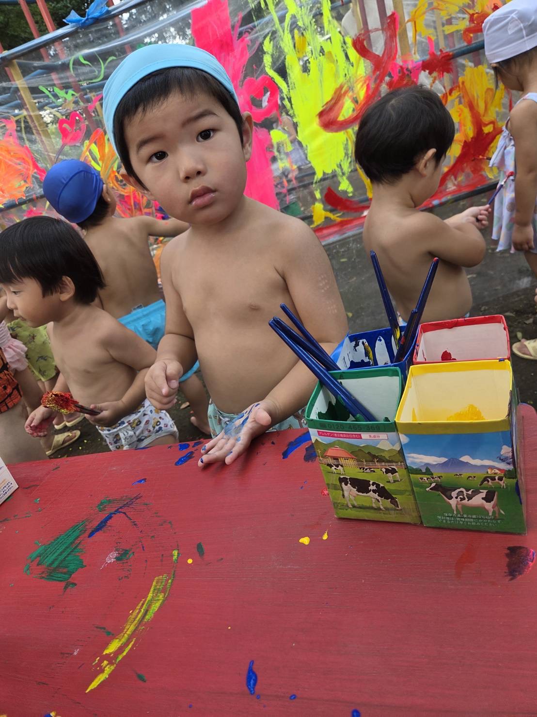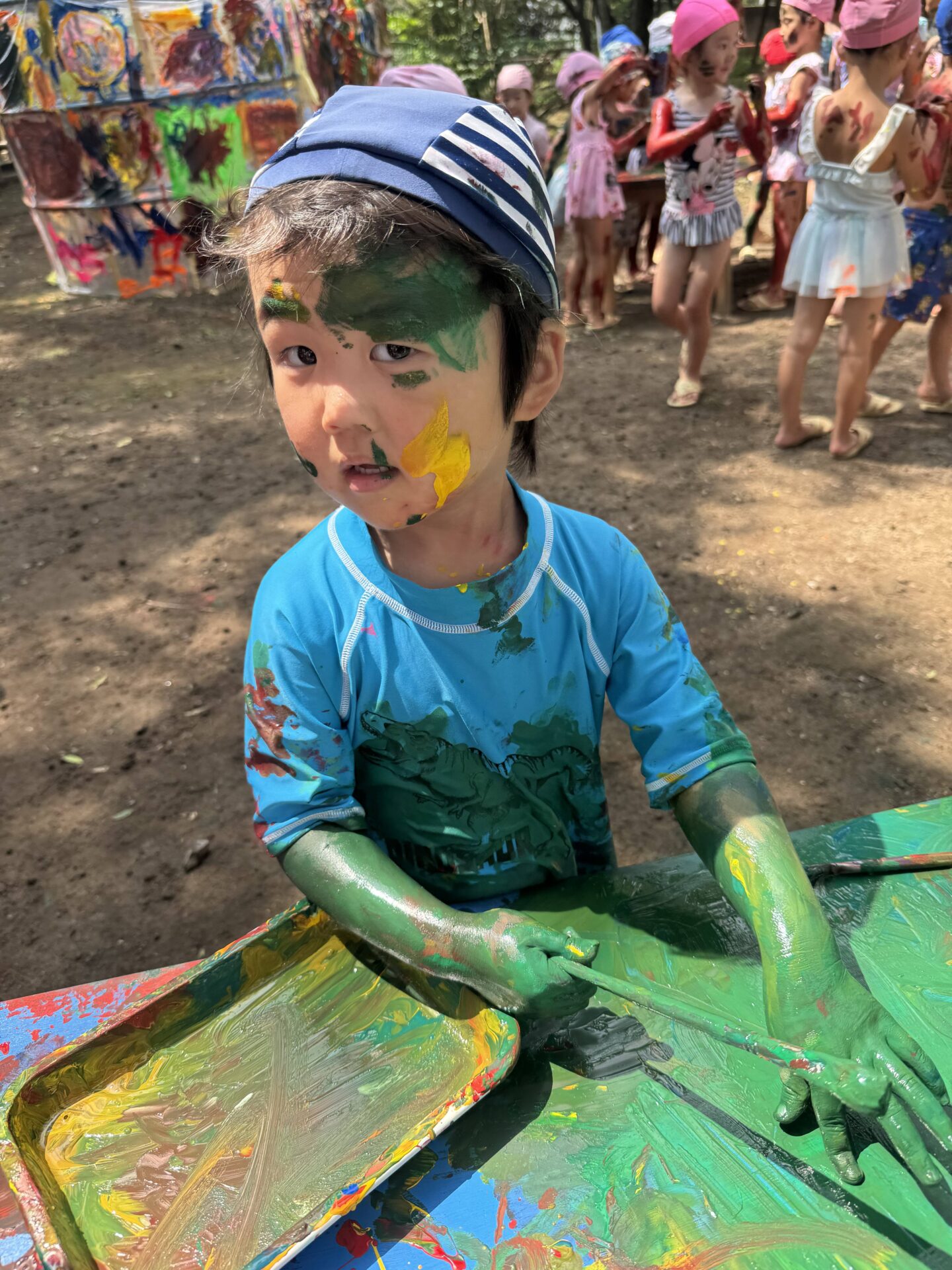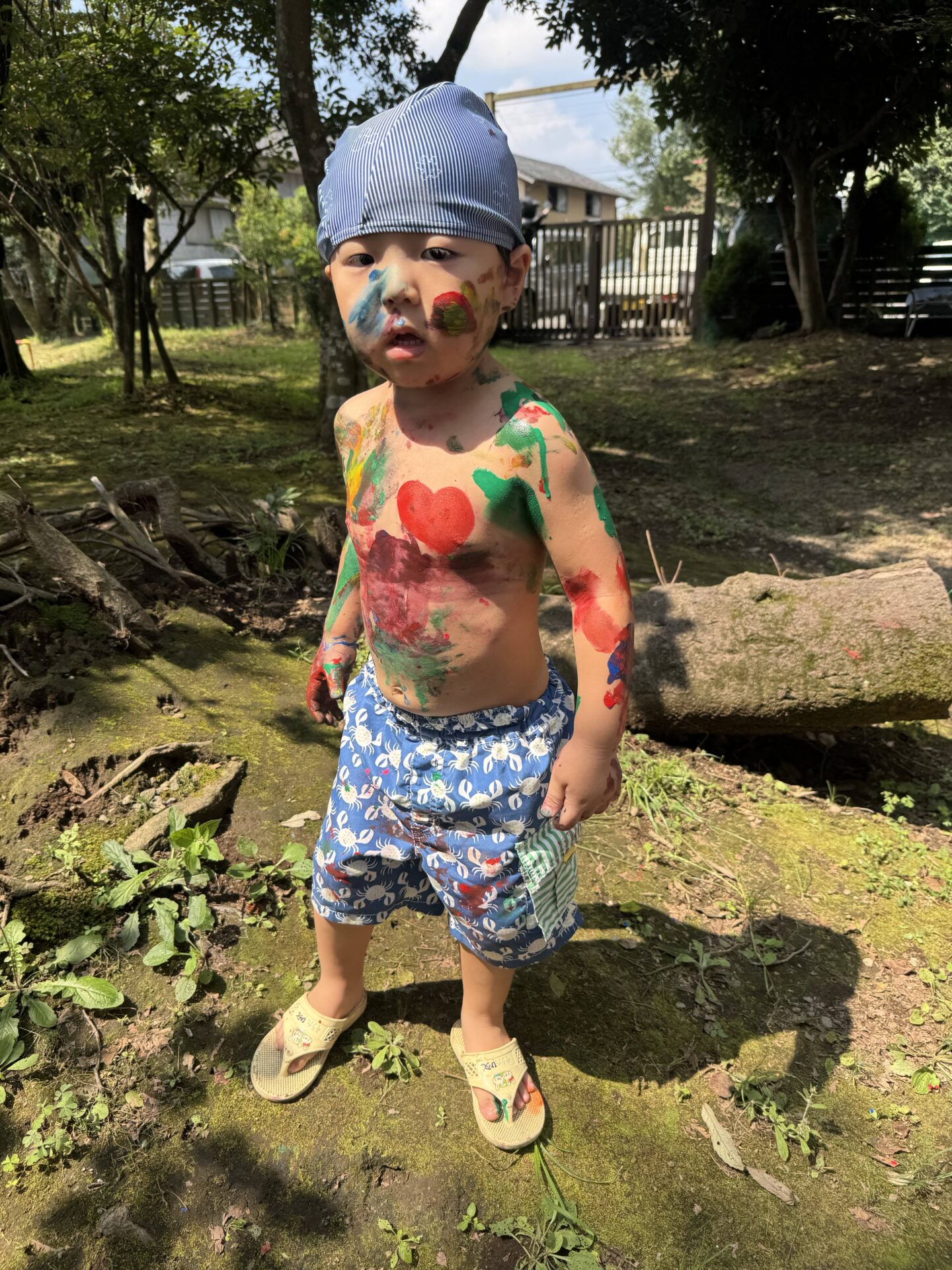 えのぐ遊びをした後はボディペインティング😆最初は体にえのぐが付くことを少しためらっていた子どもたちもいつしかダイナミックに体中にえのぐを塗って楽しみましたー!