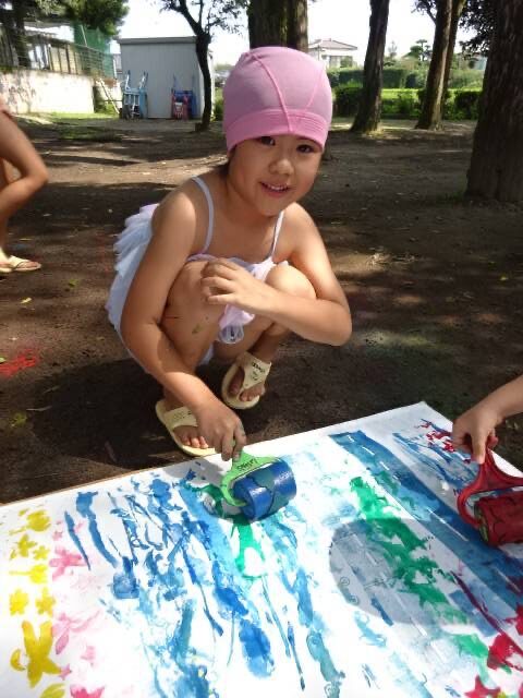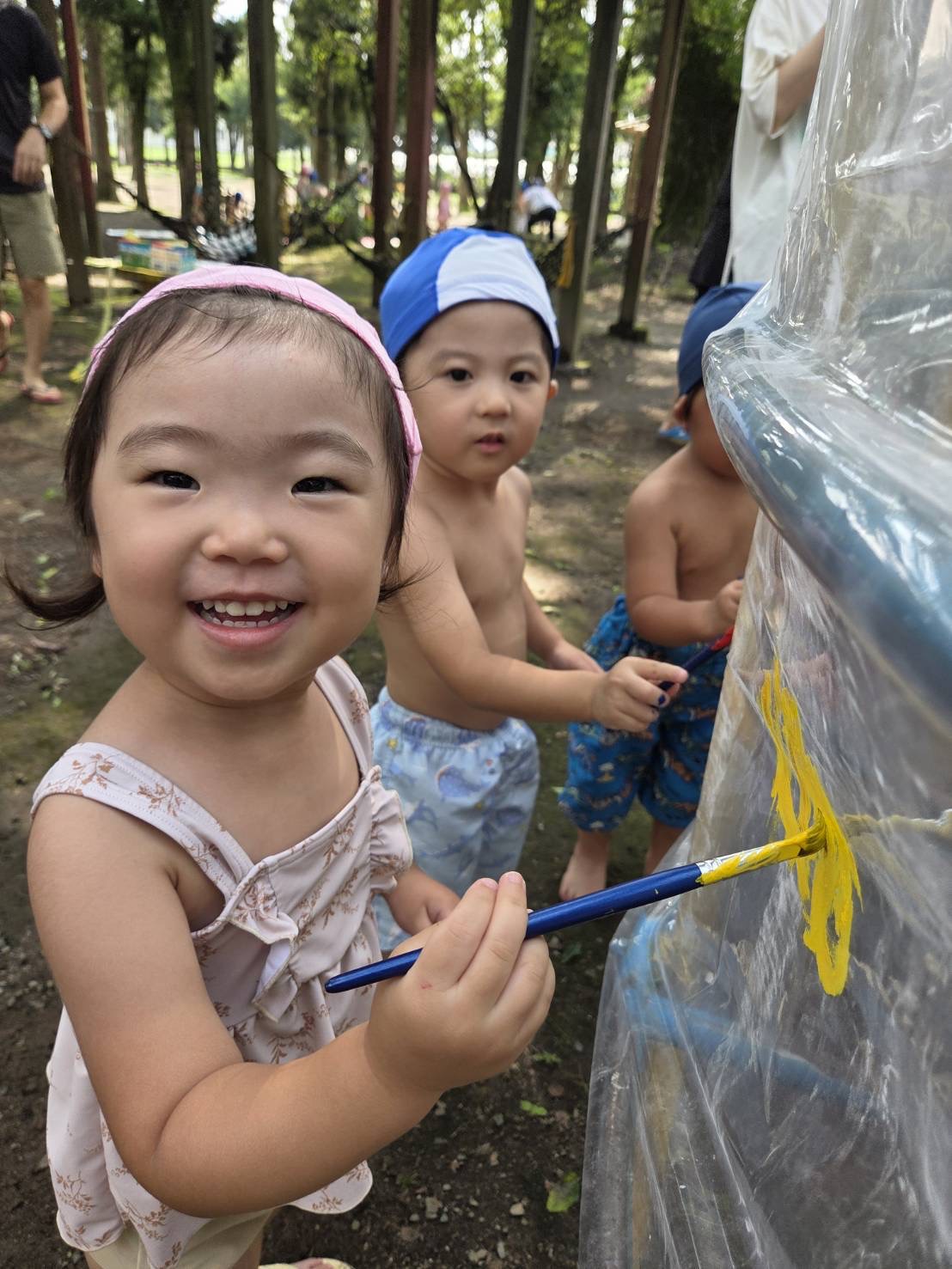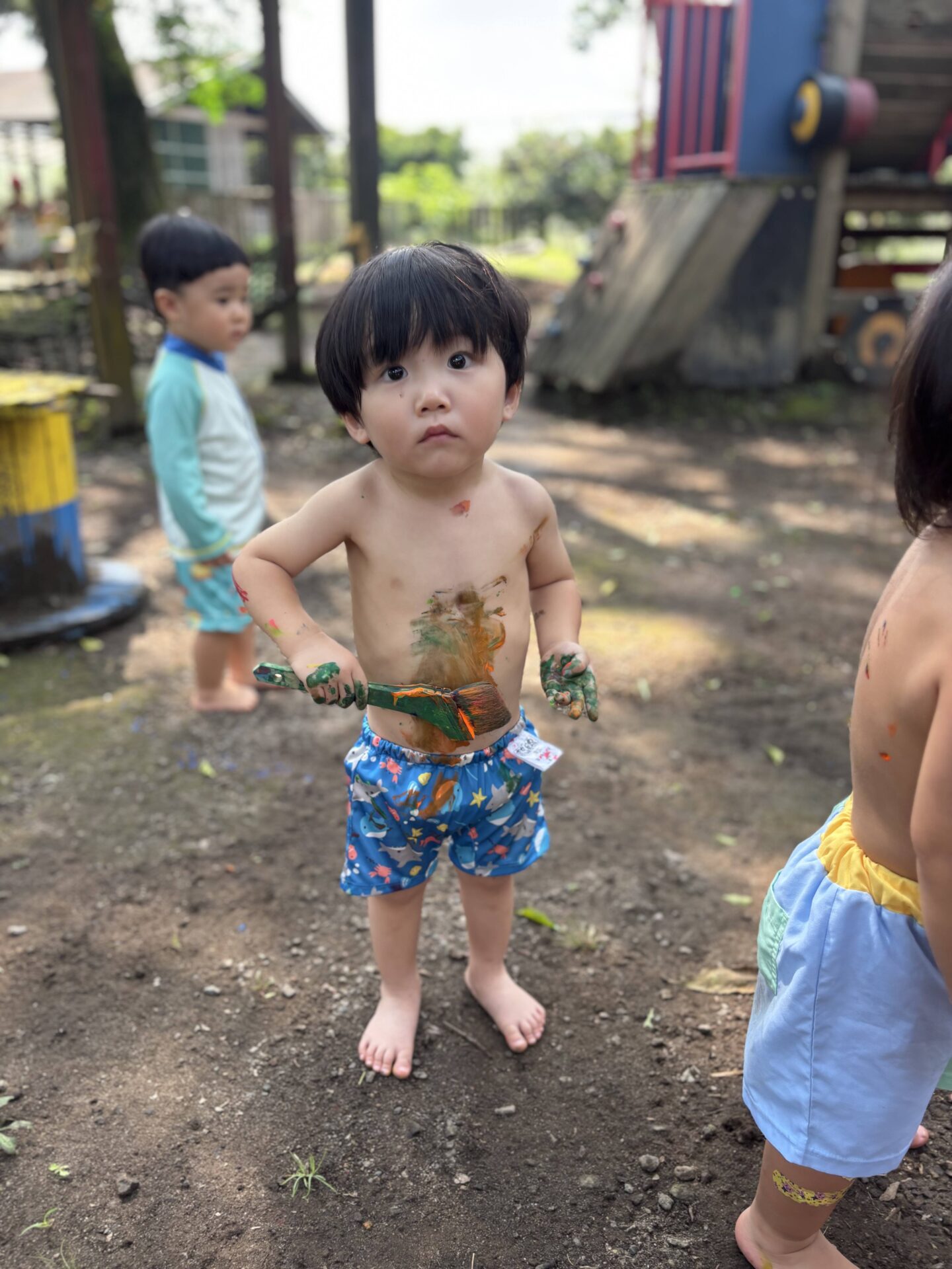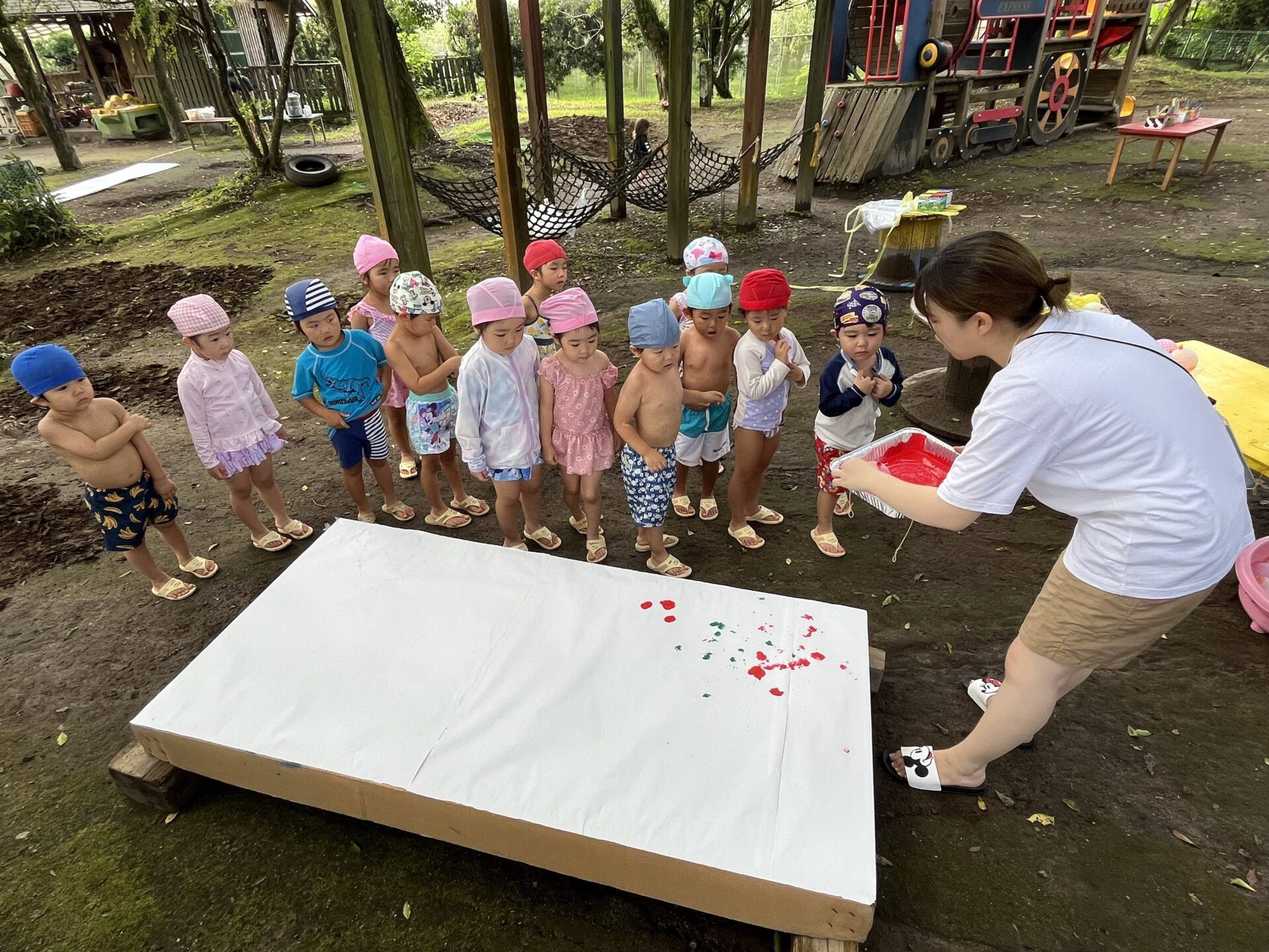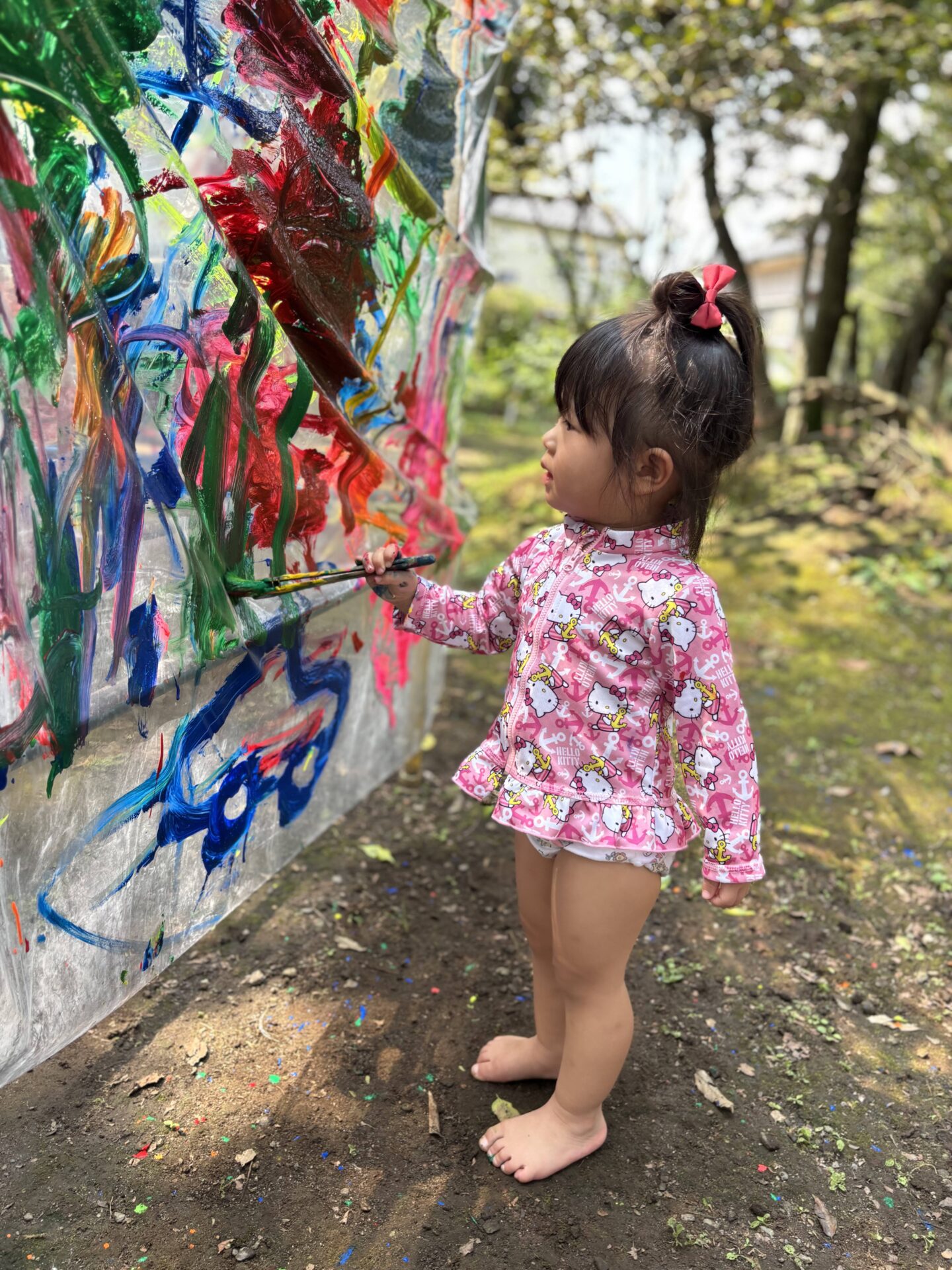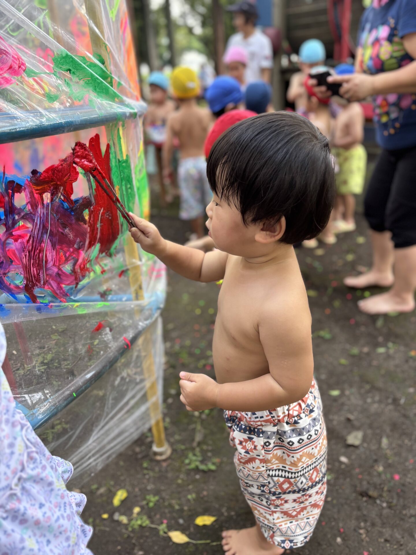 えのぐ遊びをした後はボディペインティング😆最初は体にえのぐが付くことを少しためらっていた子どもたちもいつしかダイナミックに体中にえのぐを塗って楽しみましたー!