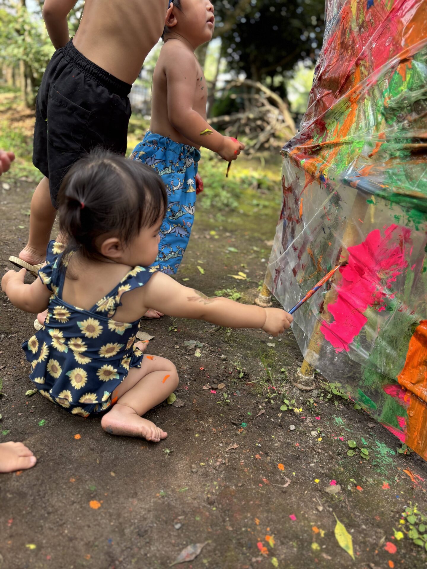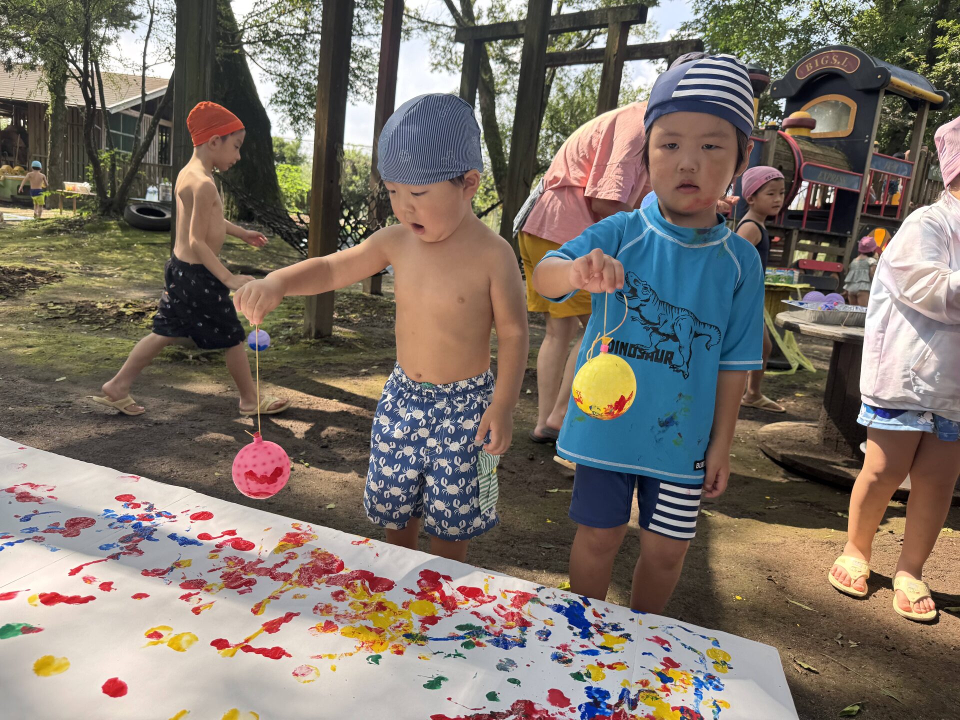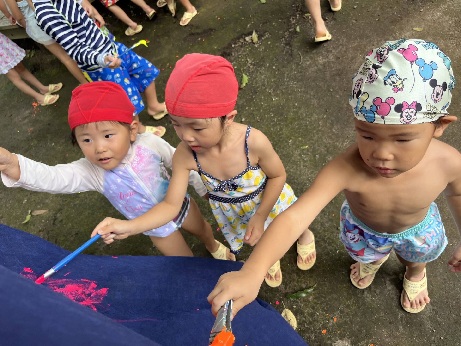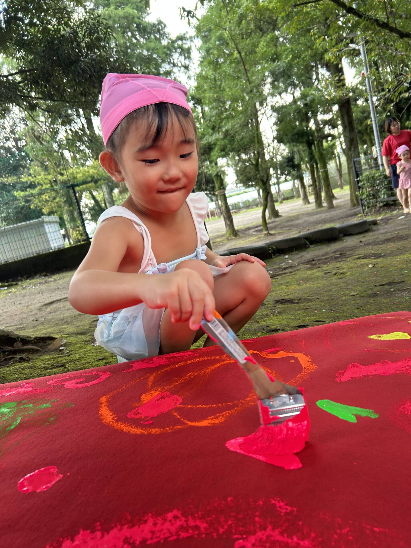 模造紙や透明シート、不織布などいろんな素材に筆やハケ、スタンプやローラー、チューブやヨーヨーなどいろんな道具を使ってえのぐ遊びをしました🎨