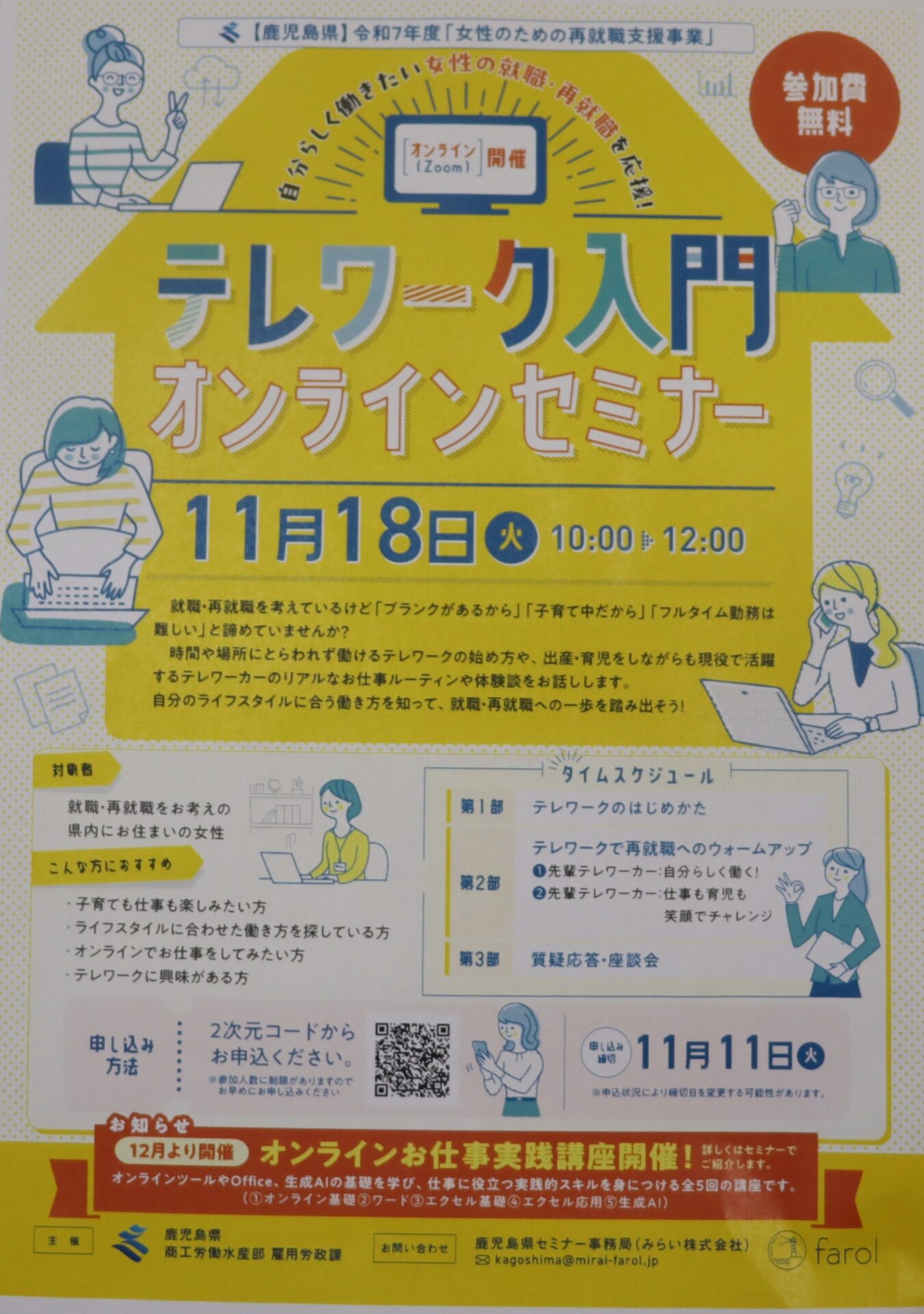 鹿児島県 雇用労政課より オンラインセミナーのお知らせが届きました