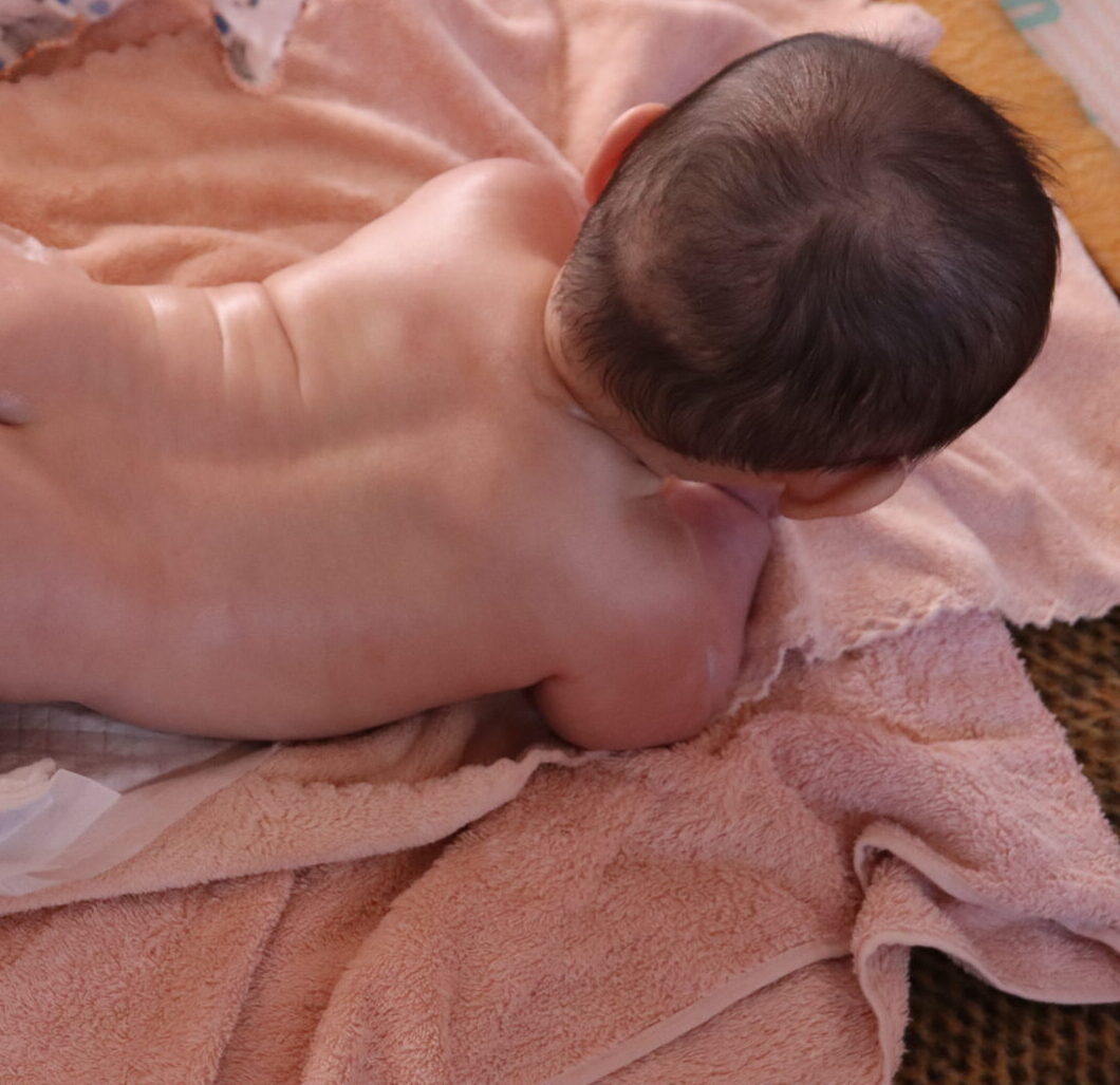 寝返りする頃の赤ちゃんたちは 何をされるのかなあとキョトンとした表情でママを見ています